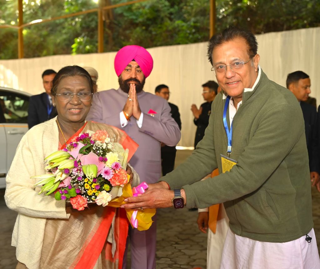 Chairman of the Temple Management Committee welcoming President Smt. Draupadi Murmu by presenting her a bouquet of flowers on her arrival at Kainchi Dham, Baba Neeb Karori Dham.