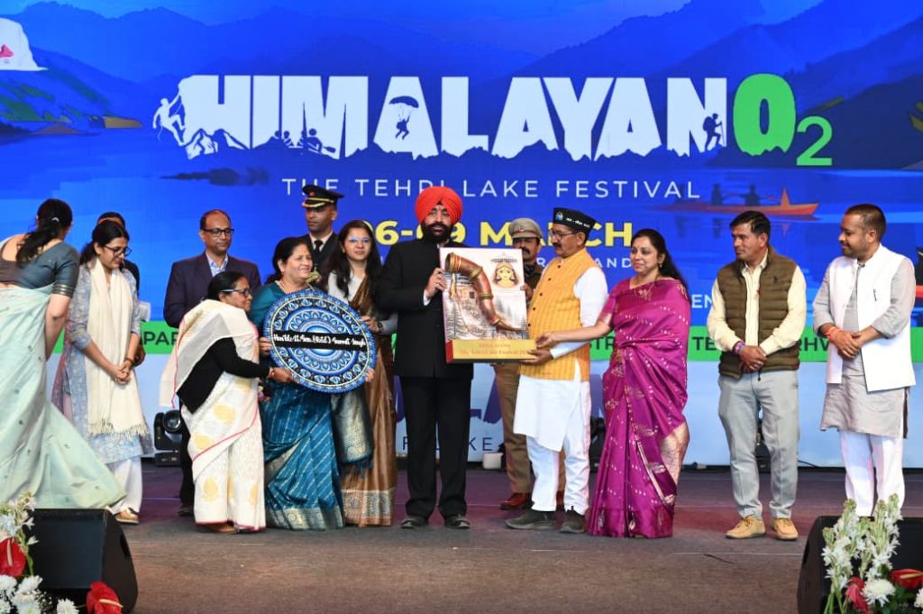 The Governor honoring a woman at 'The Tehri Lake Festival' in Tehri Garhwal.