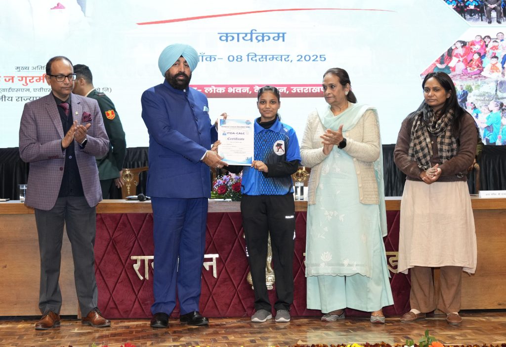 The Governor honoring a female student for her outstanding performance in computer training at the "Family Gathering Ceremony" held at Lok Bhawan.