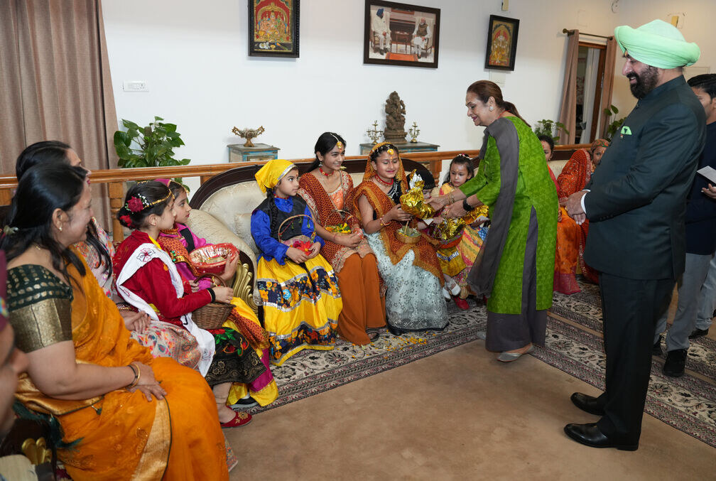 The Governor and the First Lady, Mrs. Gurmeet Kaur, warmly welcoming children at an event organized at Lok Bhavan on the occasion of Uttarakhand's traditional folk festival, Phooldei.