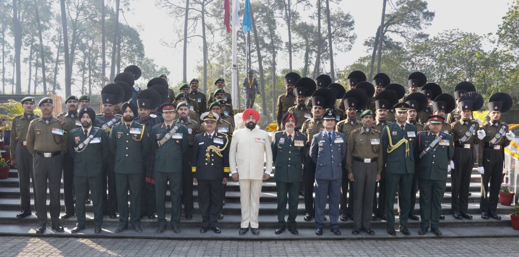 The Governor with military officers and soldiers present at Shaurya Sthal, Dehradun, on the occasion of Vijay Diwas.