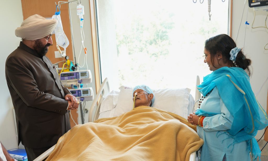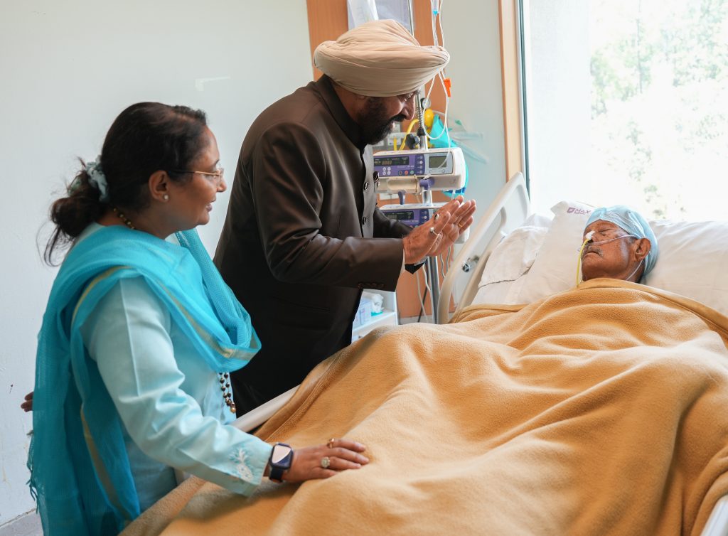 The Governor inquiring about the well-being of Mr. Siddharth Bansal, son of Rajya Sabha MP Mr. Naresh Bansal, at a private hospital in Dehradun.