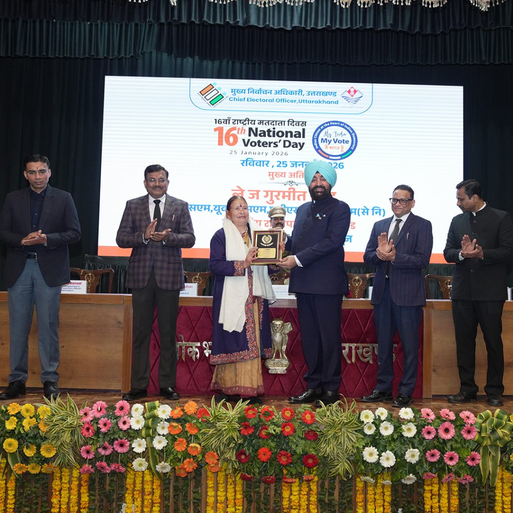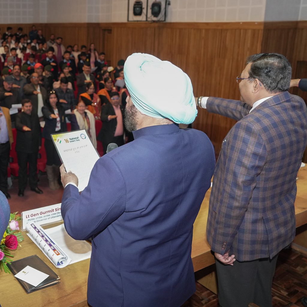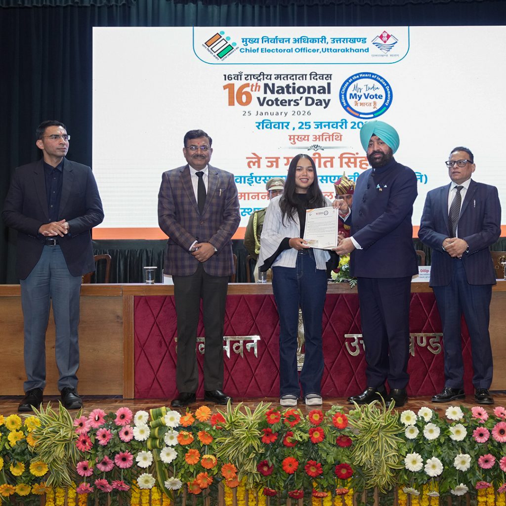 The Governor honoring a new voter who has completed 18 years of age by presenting her with a voter ID card at the state-level National Voters' Day program held at Lok Bhavan.