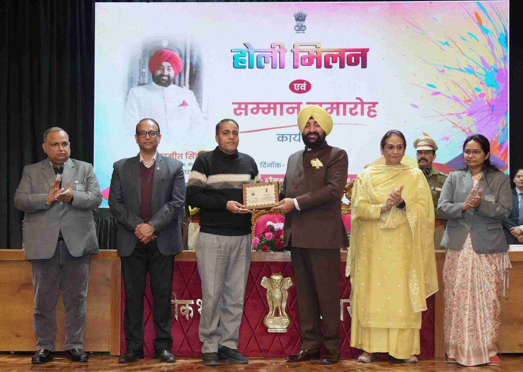 Governor honouring the personnel doing excellent work by presenting them with certificates on the occasion of Holi Milan and Samman ceremony at Lok Bhavan.