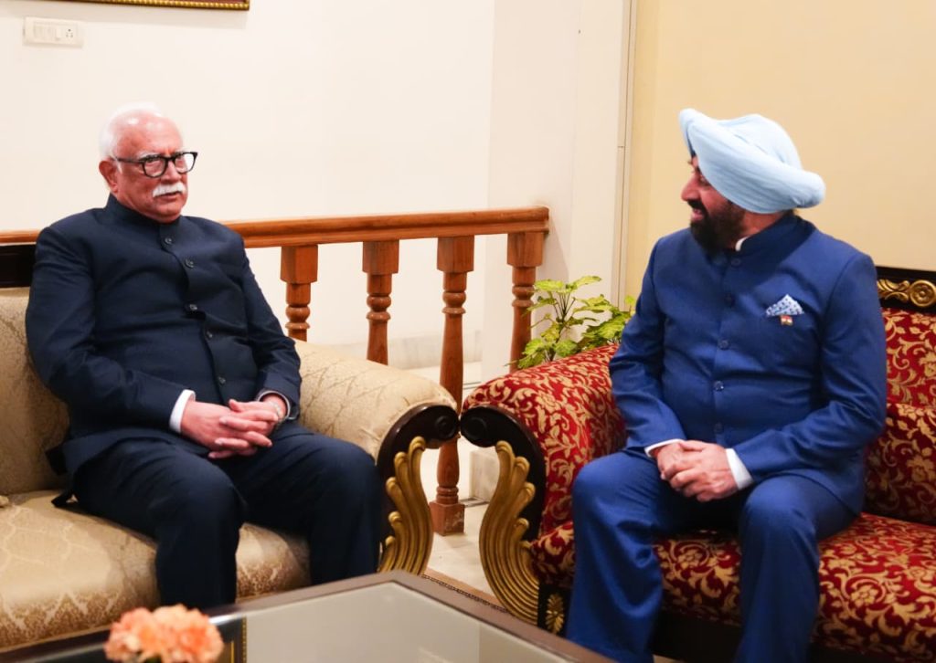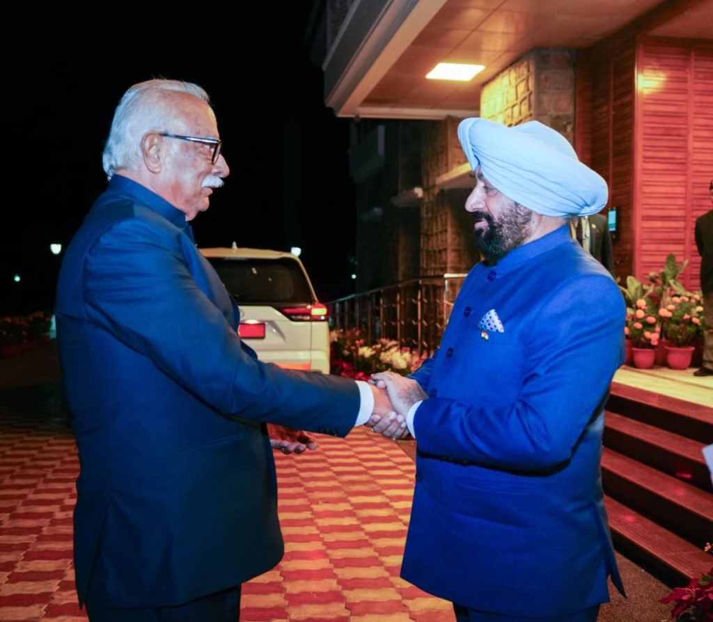 Governor Lt Gen Gurmit Singh (Retd) conversing with Governor of Goa, Shri P. Ashok Gajapathi Raju, at Raj Bhawan.