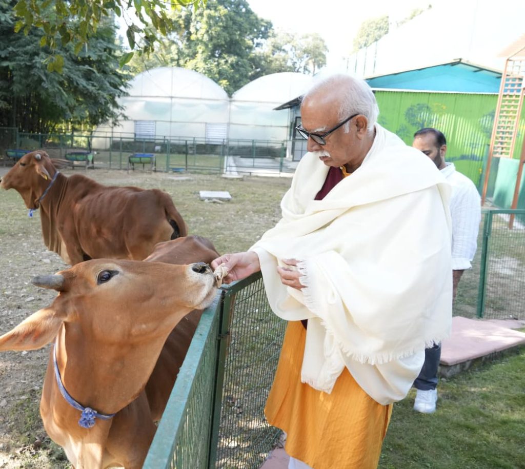 Governor of Goa, Shri P. Ashok Gajapathi Raju, feeding a cow at the Raj Lakshmi Gaushala at Raj Bhawan.
