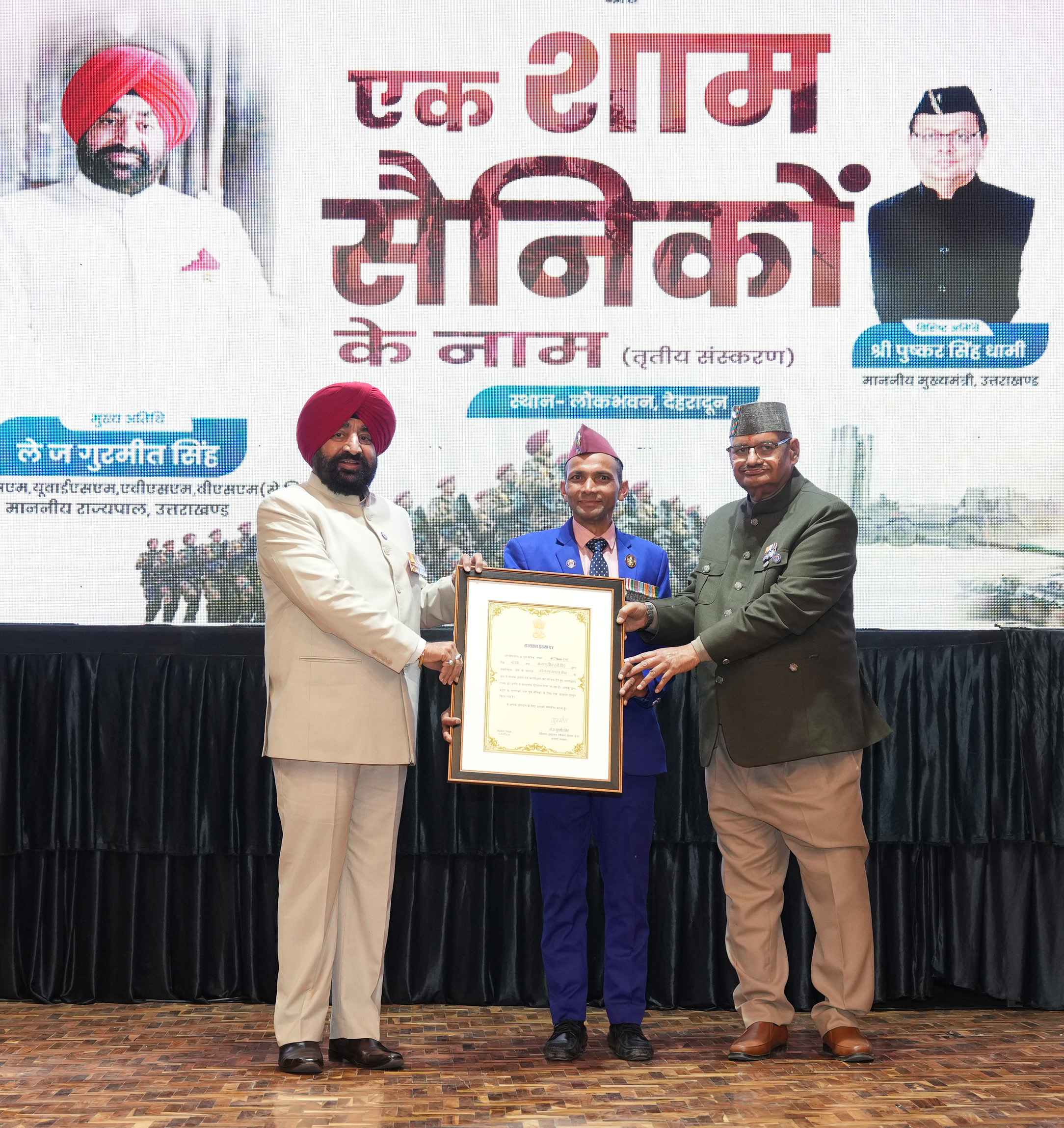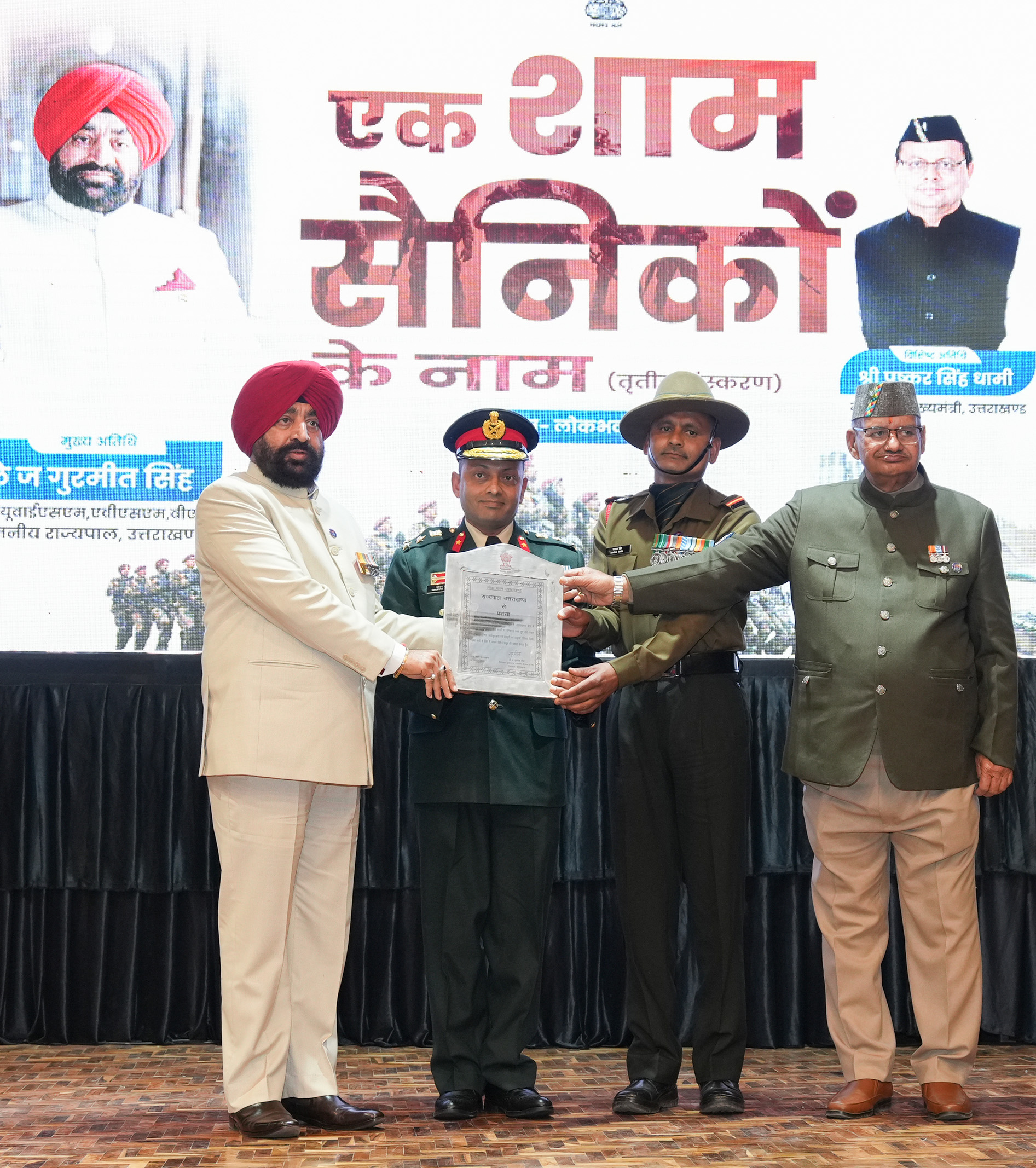 राज्यपाल लेफ्टिनेंट जनरल गुरमीत सिंह (से नि) ने बुधवार को सशस्त्र बल भूतपूर्व सैनिक दिवस (वेटरन्स डे) के अवसर पर लोक भवन में ‘‘एक शाम सैनिकों के नाम’’ कार्यक्रम में प्रतिभाग किया। सैनिक कल्याण विभाग द्वारा आयोजित इस कार्यक्रम में राज्यपाल ने वीरता पदक विजेता सैनिकों और सराहनीय कार्य करने वाले पूर्व सैनिकों को सम्मानित किया। कार्यक्रम में अर्धसैनिक बल के जवानों और अधिकारियों को राज्यपाल प्रशंसा पत्र भी प्रदान किए गए। (सूची संलग्न) कार्यक्रम में कुमाऊँ रेजिमेंटल सेंटर, रानीखेत और 9वीं माउंटेन ब्रिगेड जोशीमठ को भी उनके सराहनीय योगदान के लिए यूनिट प्रशंसा पत्र से सम्मानित किया गया।