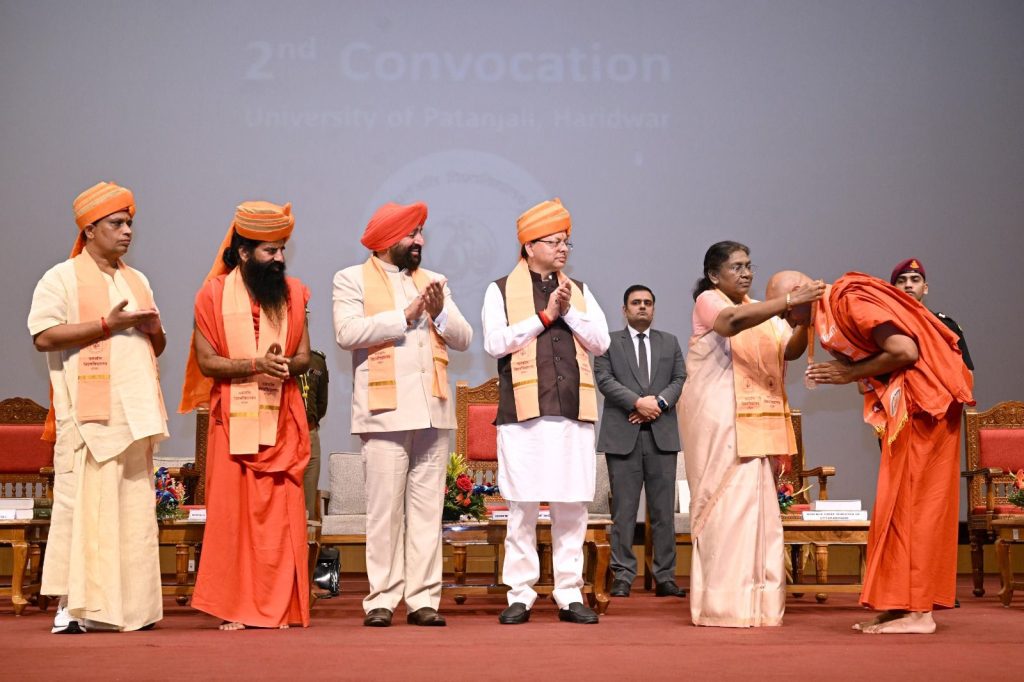 पतंजलि विश्वविद्यालय हरिद्वार के द्वितीय दीक्षांत समारोह में उपाधि व मेडल प्राप्त शोधार्थियां एवं विद्यार्थियों के साथ राष्ट्रपति श्रीमती द्रौपदी मुर्मु साथ में राज्यपाल एवं मुख्यमंत्री।