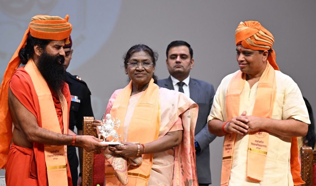 पतंजलि विश्वविद्यालय हरिद्वार के द्वितीय दीक्षांत समारोह में शोधार्थियां एवं विद्यार्थियों को उपाधि व मेडल प्रदान करती हुईं राष्ट्रपति श्रीमती द्रौपदी मुर्मु।