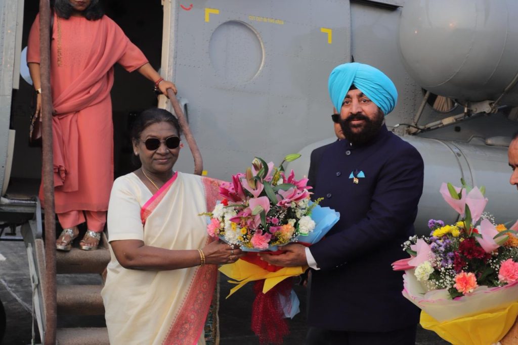राष्ट्रपति श्रीमती द्रौपदी मुर्मु हल्द्वानी आर्मी हेलीपैड पहुंचने पर उनका स्वागत करते हुए राज्यपाल।