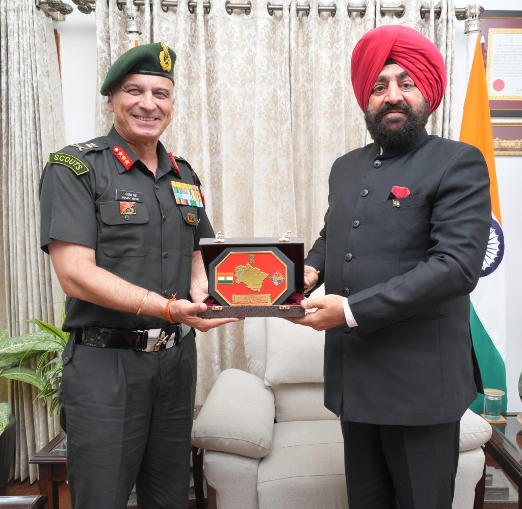 राज्यपाल लेफ्टिनेंट जनरल गुरमीत सिंह (से नि) से शिष्टाचार भेंट करते हुए उप सेना प्रमुख (रणनीति) लेफ्टिनेंट जनरल राजीव घई।