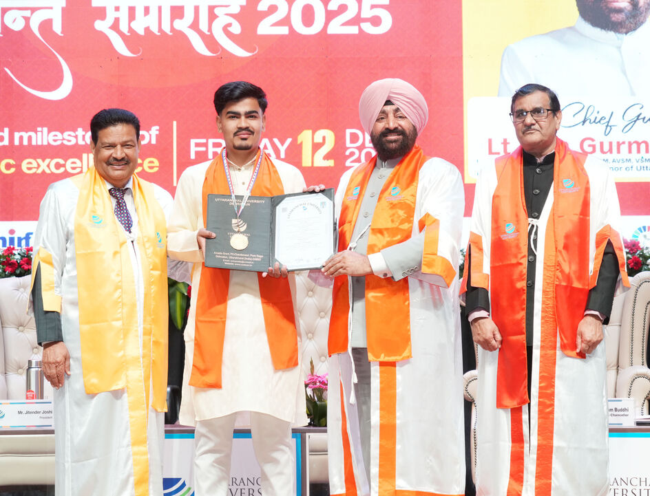 उत्तरांचल विश्वविद्यालय, देहरादून के छठे दीक्षांत समारोह कार्यक्रम के अवसर पर छात्र को मेडल और उपाधि प्रदान करते हुए राज्यपाल।