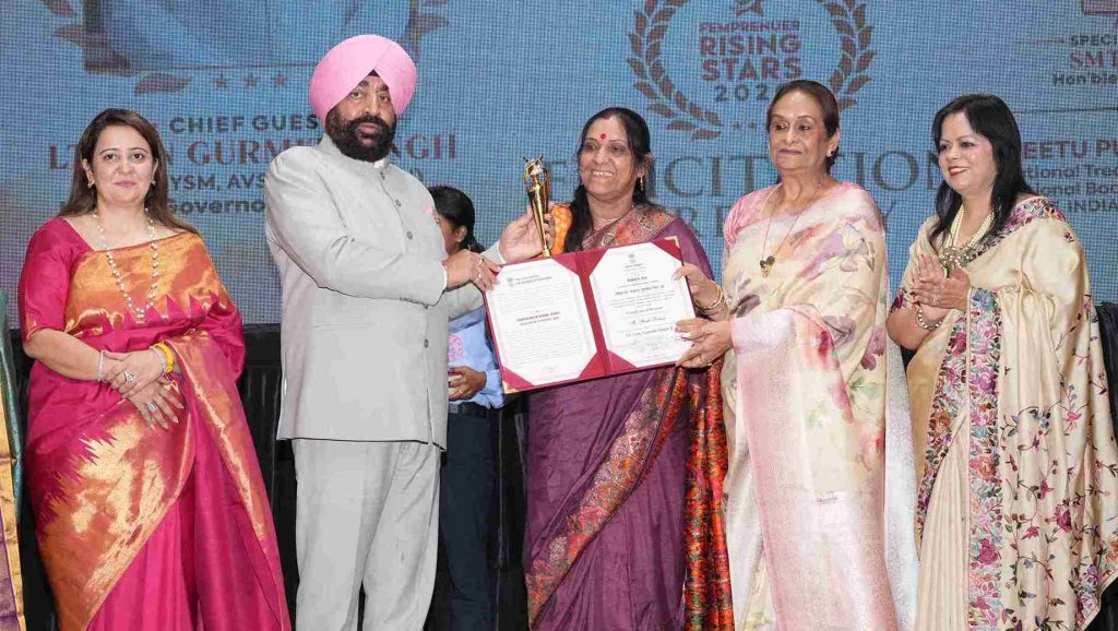 “महिला उद्यमीः उभरते सितारे” सम्मान समारोह के अवसर पर विभिन्न क्षेत्रों में उत्कृष्ट योगदान देने वाली महिला उद्यमियों को सम्मानित करते हुए राज्यपाल एवं प्रथम महिला श्रीमती गुरमीत कौर।