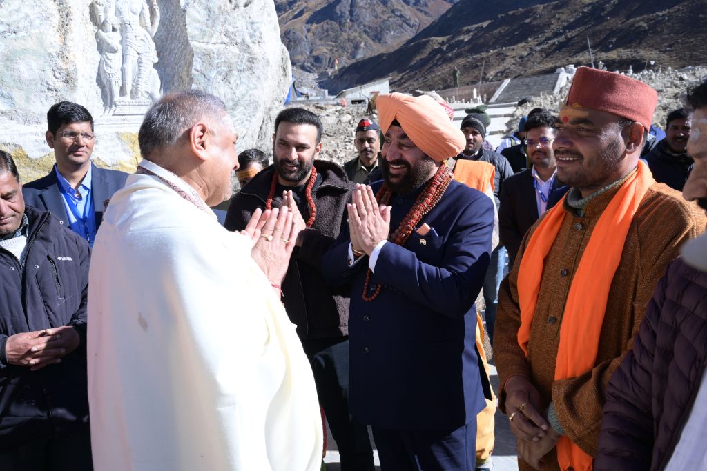 केदारनाथ धाम में मंदिर परिसर के तीर्थ पुरोहितों से भेंट करते हुए राज्यपाल।