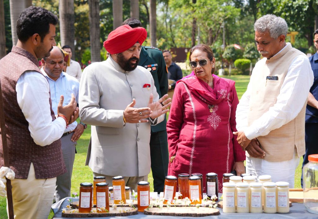 लोक भवन में स्थापित मधुमक्खियों के बक्सों से हनी बी प्रोसेसिंग (शहद निकालने की प्रक्रिया) का अवलोकन करते हुए राज्यपाल एवं प्रथम महिला श्रीमती गुरमीत कौर।