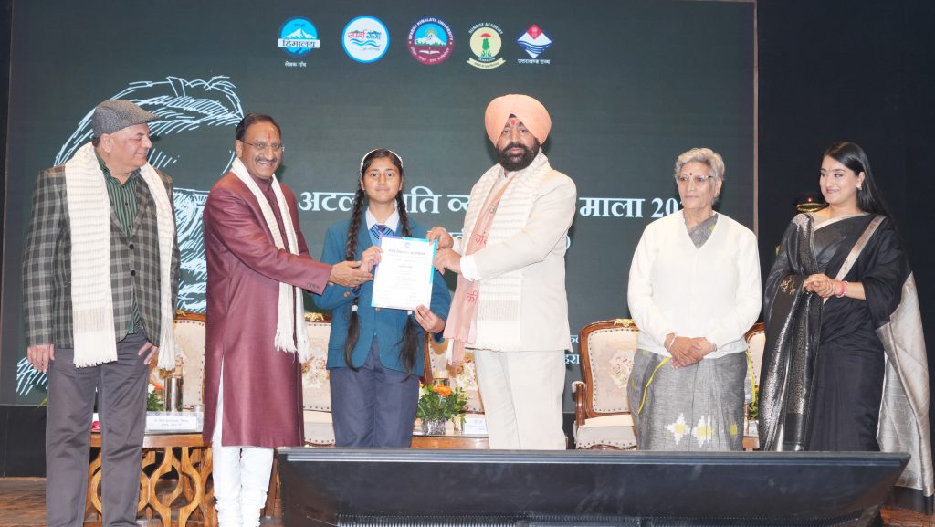 “अटल स्मृति व्याख्यान माला-2025” कार्यक्रम के अवसर पर छात्रा को सम्मानित करते हुए राज्यपाल।