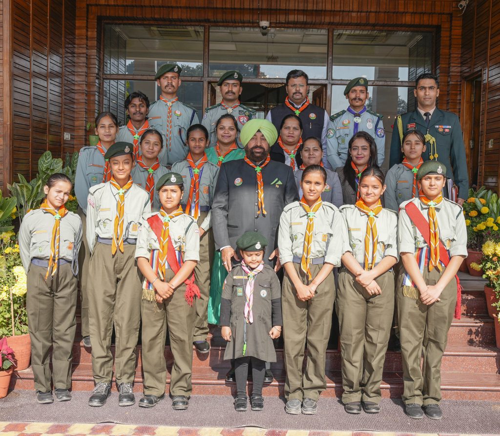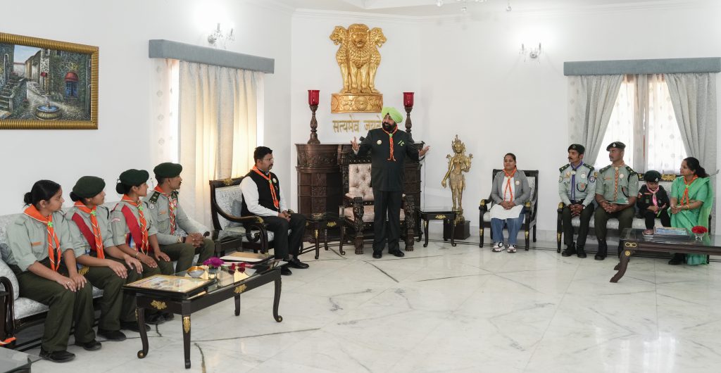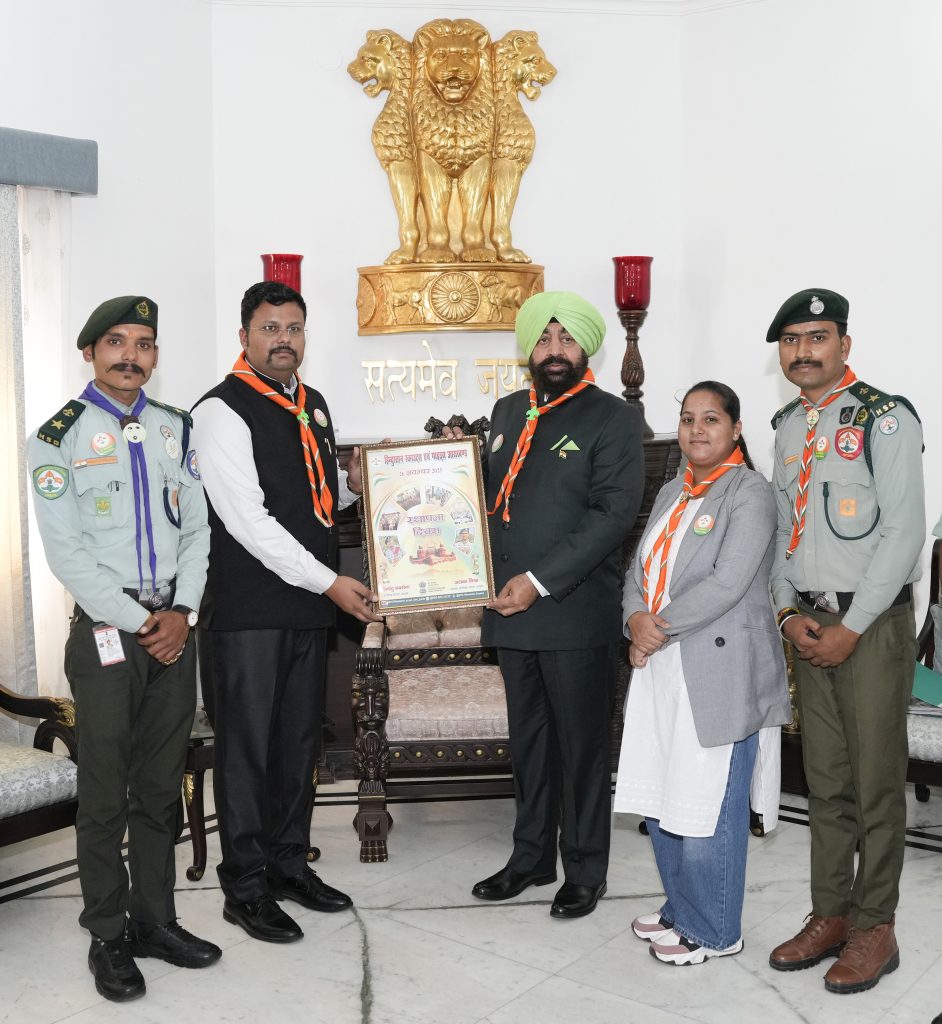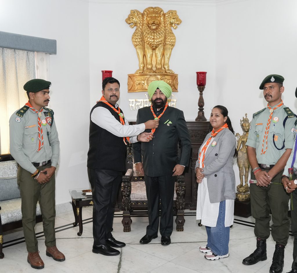 26-11-2025 : भारत स्काउट्स एवं गाइड्स के स्थापना दिवस के अवसर पर राजभवन में राज्यपाल को स्कार्फ और स्टीकर पहनाते हुए भारत स्काउट्स एवं गाइड्स के प्रतिनिधिमंडल।