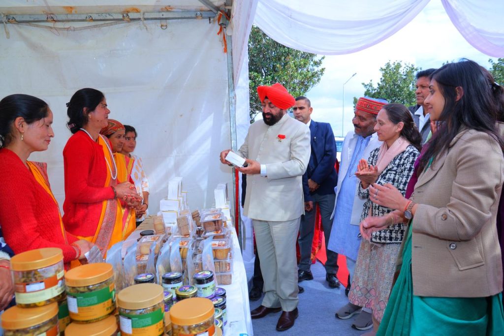 सर्किट हाउस, पौड़ी में स्वयं सहायता समूहों की महिलाओं द्वारा लगाए गए स्टॉलों का निरीक्षण कर जानकारी प्राप्त करते हुए राज्यपाल।