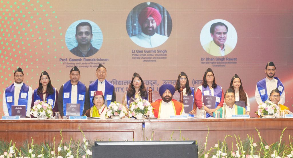 दून विश्वविद्यालय के छठे दीक्षांत समारोह में छात्र-छात्राओं के साथ राज्यपाल।