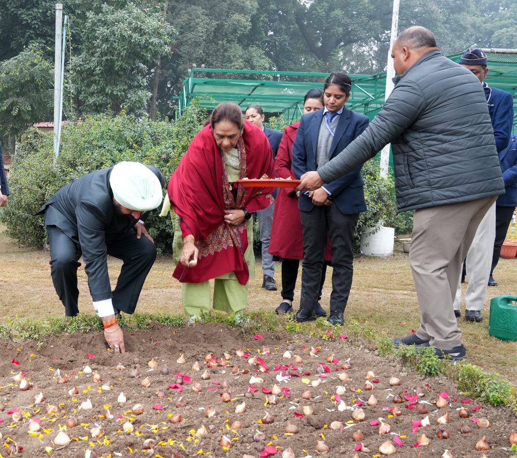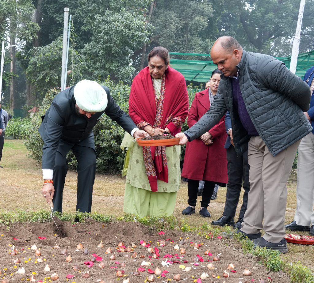 लोक भवन परिसर में ट्यूलिप बल्ब का रोपण करते हुए राज्यपाल एवं प्रथम महिला श्रीमती गुरमीत कौर।